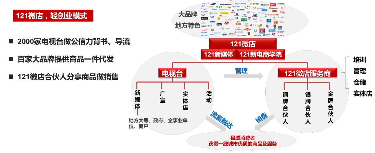 2017年的两会,李克强总理再次把分享经济写进政府工作报告。121微店,不仅积极响应国家精准扶贫的政策,也站在了移动互联时代分享经济的风口。121微店凭借2000家县市级电视台的公信力背书与导流、百余家一线大品牌和地方特色农产品的商品支持,一方面,为每一个拥有创业情怀的个人实现创业梦想,摆脱创业之“重”,轻松脱贫致富;另一方面将品优价廉的大品牌和地方特色农产品“带”给自己亲朋好友。121微店的“轻模式”在未来必将改变县域9亿人口的市场生态,让另一半中国也同享精准扶贫与分享经济的惠果。