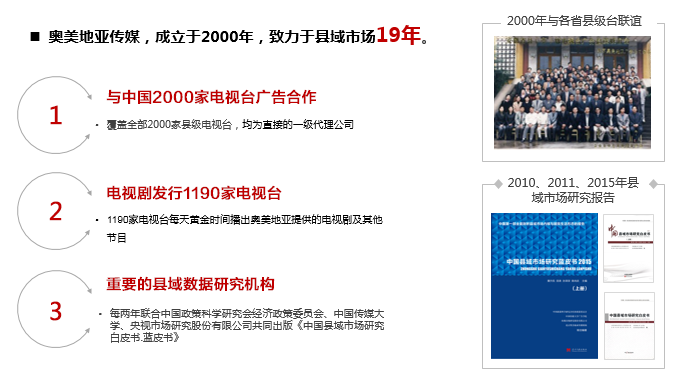 奥美地亚传媒机构成立于2000年,是一家专注于县域市场的综合性传媒与电子商务集团。